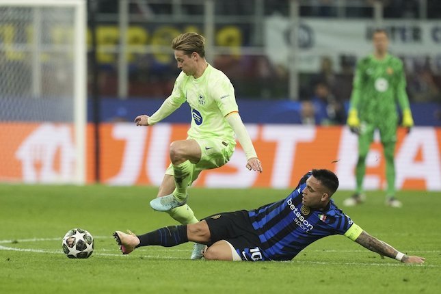 Perebutan bola antara gelandang Barcelona, Frenkie de Jong dan penyerang Inter Milan, Lautaro Martinez di leg kedua semifinal Liga Champions 2024-2025. (c) AP Photo/Antonio Calanni