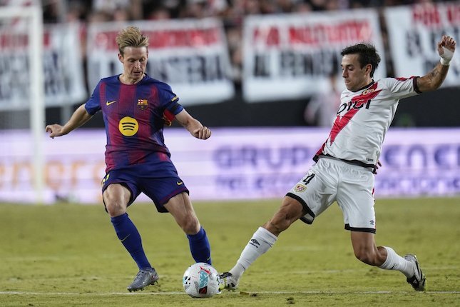 Frenkie de Jong (Barcelona) dan Pedro Diaz (Rayo) berduel merebut bola dalam laga La Liga Spanyol di Vallecas stadium, Madrid, 31 Agustus 2025 (c) AP Photo/Manu Fernandez